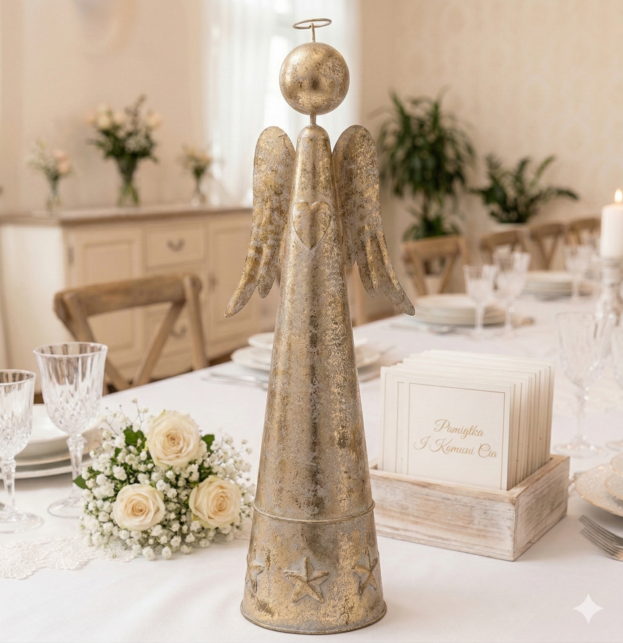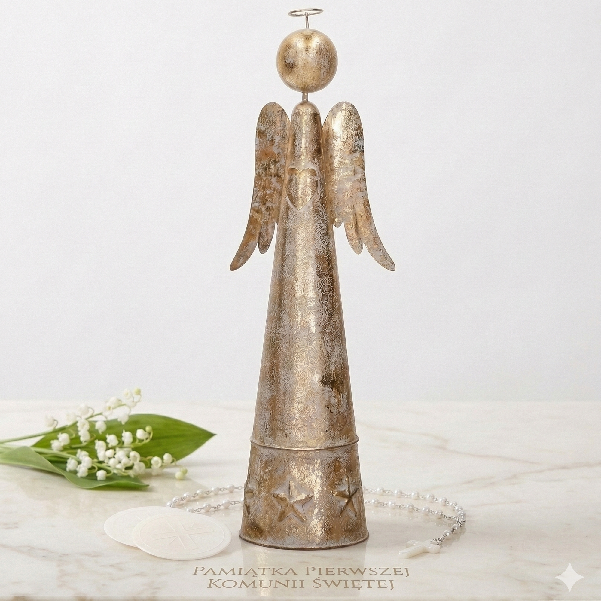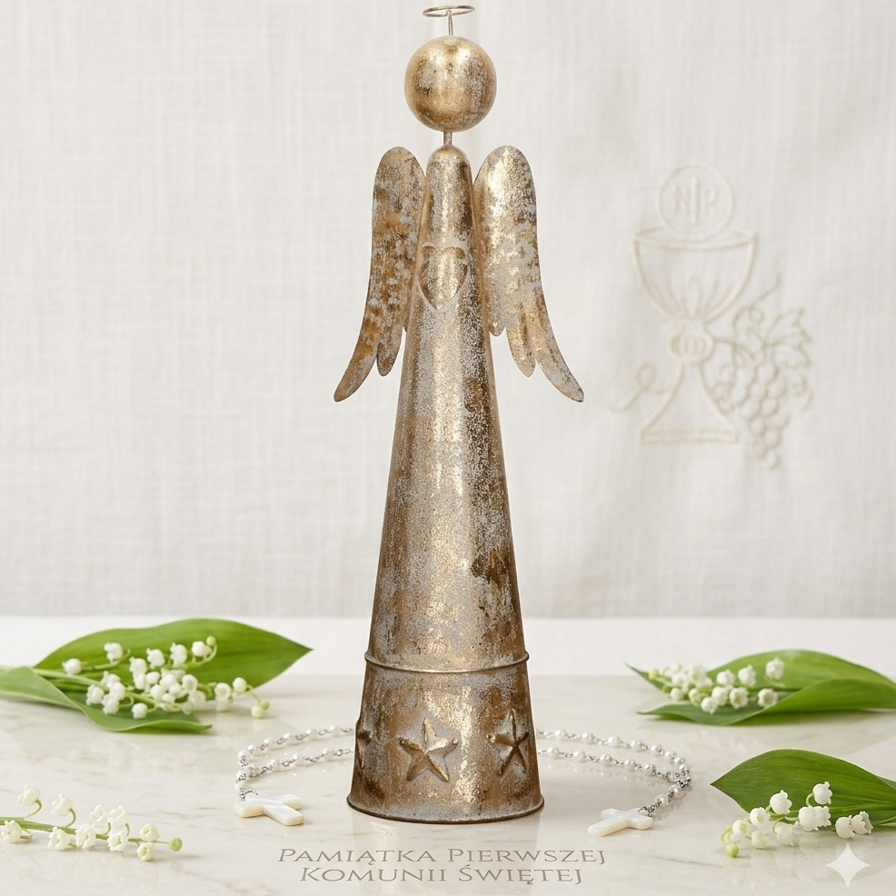Piękny złoty anioł wykonany z metalu to idealna ozdoba świąteczna, która wprowadzi do Twojego domu urok i elegancję. Anioł wyróżnia się stożkowym kształtem i subtelnymi detalami, takimi jak gwiazdki u podstawy oraz serce na klatce piersiowej. Jego postarzana, złota powierzchnia dodaje mu antycznego charakteru, dzięki czemu świetnie komponuje się z tradycyjnymi oraz nowoczesnymi dekoracjami świątecznymi. Idealny na stół, kominek czy parapet, anioł ten stanie się centralnym elementem każdej świątecznej aranżacji.